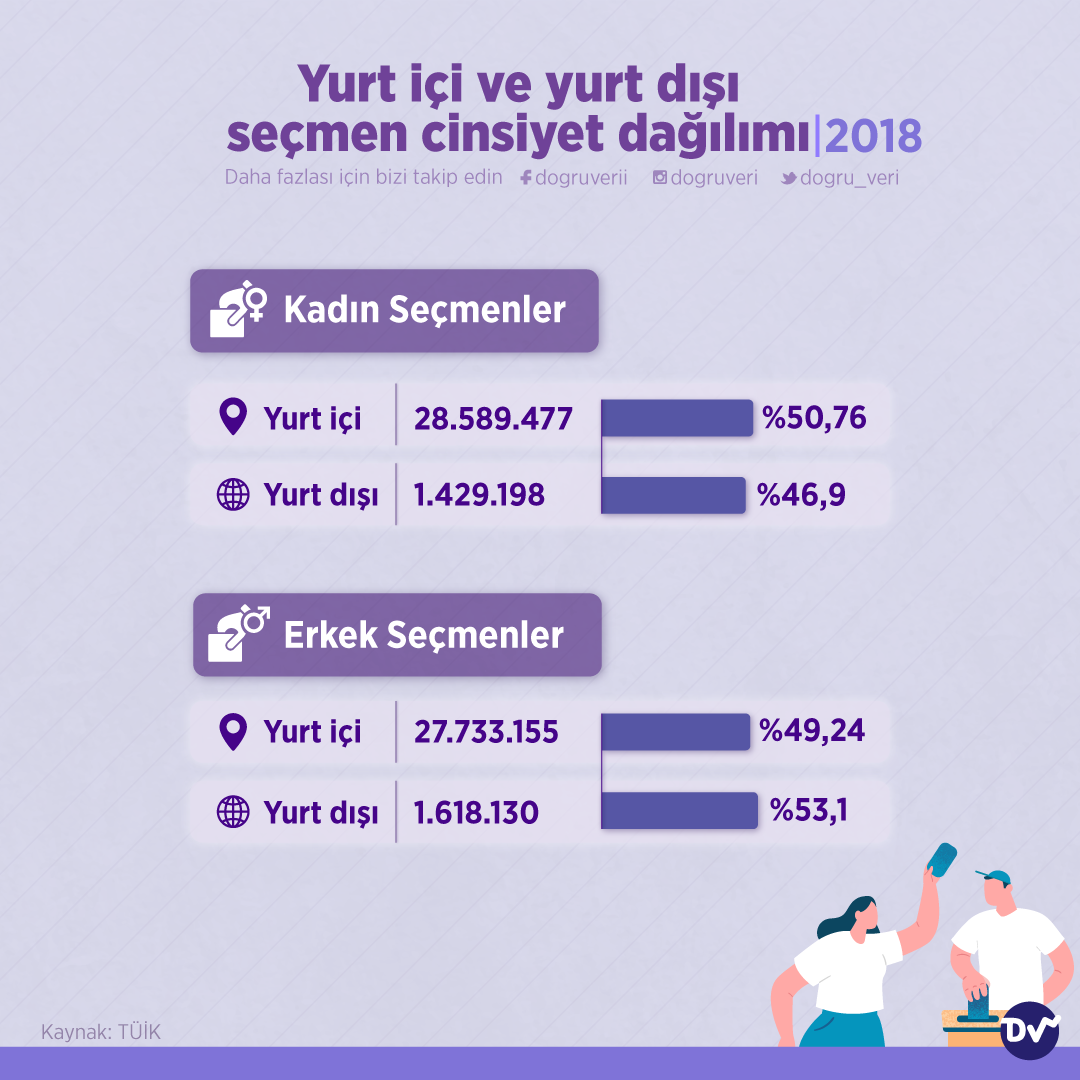 TÜİK’in 2018 verilerine göre yurt içi ve yurt dışındaki seçmenlerin cinsiyetlerine göre dağılım oranını derledik. Buna göre, yurt içinde kadın seçmen oranının daha fazla olduğu görülürken yurt dışında ise erkek seçmen oranının daha fazla olduğu görülüyor.